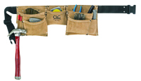 APRON CARPENTER SUEDE 12POCKETp belt stable, double-gusset front pocket provides extra capacity and easy access, 5 main pockets, 7 smaller pockets and sleeves, center pocket for tape measure or extra nails, web loop for pry bar, and pouch handle allows for simple belt adjustments and easy one handed carrying.