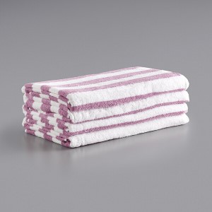 California Cabana 30" x 70" lavender stripes ring-spun 100% cotton pool towel! This towel's 20 double ring-spun 100% cotton construction provides a beautifully soft feel. Its superior design offers excellent absorbency for long-lasting, outstanding performance at your business. This pool towel boasts a 15 lb. weight per dozen - its soft and strong design is sure to enhance your guests' experience. Its generous 30" x 70" size is sure to envelop your guests in a warm embrace and allow them to dry off quickly.
