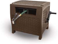 Durable, contemporary design conceals hose and reel. Slide Trak hose guide makes winding and unwinding hose easier. Comes fully assembled. 5/8" standard vinyl hose capacity. Sturdy wicker resin construction.