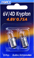 These replacement bulbs are designed to work in 6 V and 4 D lights. They are 4.8 V, 0.75 A and are brighter and tougher than the competition.
