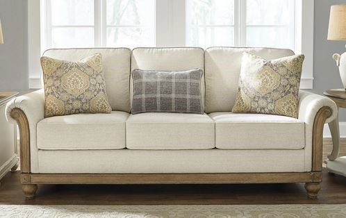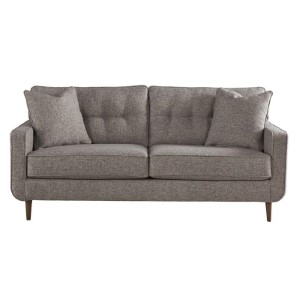 Features- Sofa Blocked corner frame Loose seat and back cushions attached High resilience foam cushions wrapped in thick polyfiber 2 decorative pillows included Pillows with soft polyethylene filling Polyester / Nylon Upholstery Linen / Viscose Pillows Exposed feet with synthetic wood finish Dimensions: 84" W x 37.5" D x 38.5" H