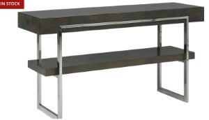 Characterized by gorgeous design, the Isleen sofa table is both modern and charming. Featuring a clean contemporary design, this table is skillfully crafted with wood solids and burl veneers in a gray finish. Chrome metal legs grant an innovative modern appeal, while a hidden pullout tray provides extra room to display decor or place appetizers. Hosting earthy wood grain detail, it features a lower shelf that offers abundant space while adding dimension to the piece. This table fits perfectly behind a sofa or against a wall, adding visual appeal to any area.