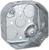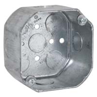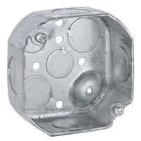 Four 1/2 in conduit knockouts (sides). Four 1/2 in conduit knockouts (bottom). #bracket. Used in the installation of ceiling or wall lighting fixtures or as a junction box. 1-1/2 in deep, 15.5 cu-in capacity. Not designed for ceiling fan support. 50 lb maximum recommended static load. Acceptable for use in 2 hrs fire rated walls. UL listed. UPC bar code.