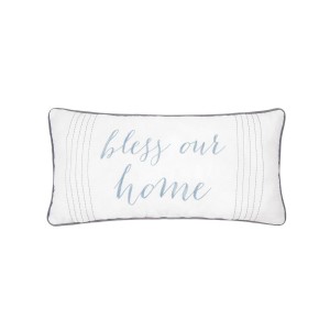 Add simplistic and graceful touches to your living spaces with this casual accent pillow. Featuring an embroidered blessing and vertical stripes in slate blue, this cotton pillow will bring peaceful touches to your home. Finished with a contrasting piped edge on a white ground. Spot cleaning recommended. Pair with our Dandelion Court bedding and tabletop collections for a complete room refresh.