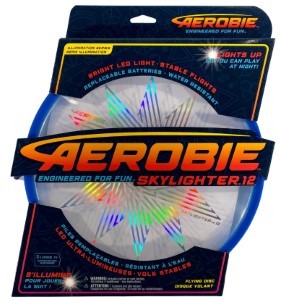 Keep the fun going into the night with the Aerobie Skylighter Disc! The superbright lights inside this light-up flying disc create brilliantly illuminated flights, adding to the fun. The Skylighter includes a spoiler rim for more accurate flights, a cushioned edge for excellent grip and a soft catch, a wide 12-inch diameter for greater stability, a sonically welded lighting module, and includes 2 long-life CR2032 (3V) Lithium Coin Cell batteries. (Batteries are replaceable.) Available in assorted colors. Sold individually. Ages 10+.