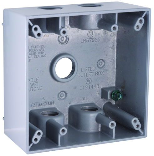 For use in branch circuit wiring in wet, damp or dry locations. Can be used as a weatherproof junction box or as a housing for receptacles, switches and GFCIs. Die-cast aluminum construction. Reinforced connector outlets. Powder coat finish. Eight box mounting options with detachable lugs provided. Five 1/2 in threaded outlets. 31 cu-in capacity. Two closure plugs included. Ground screw installed. Internal threads and hubs comply with NEMA requirements. Hubs accept all threaded fittings and threaded conduit. 2 in D x 4-1/2 in L x 4-9/16 in W. Multi-lingual instructions. UL listed. NEMA 3R Rated.