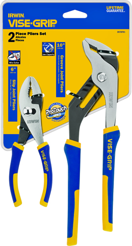 ProTouch grips provide extra comfort and reduces hand fatigue. Machined jaws for maximum gripping strength. Induction hardened cutting edge stays sharper, longer. Includes one 6 in slip joint pliers and one 10 in groove joint pliers.